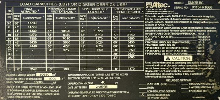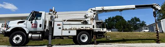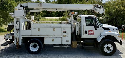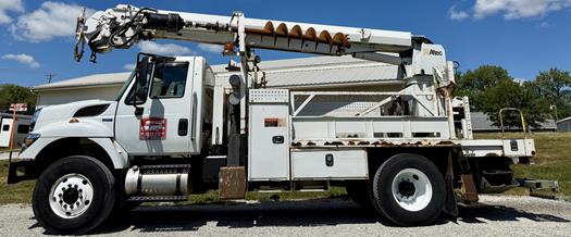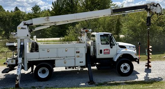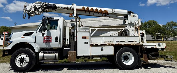 2015 International 7400 Digger Derrick/Boom Truck Service/Utility Truck VIN: 1HTWCAAR0FH679057 7.6L Diesel Engine Allison Push Button Automatic Transmission Altec DM47B-BC Boom Serial Number: 0115FR1666 47’ Sheave Height 17,730LB Capacity 3 Section Hydraulic Boom 2 Speed Digger Tip Winch Pole Grabs 4 Hydraulic Outriggers Stand Up Controls (Adjustable Height) Rear Mounted Boom 2,626 PTO Hours Boom Manuals Auger 6 Storage Compartments Vice Beacons with Cab Controls 2 Bucket Seats AC Heat AM/FM Stereo Cruise Control 12 Volt Plugs Backup Camera Differential Lock Single Axle/Dual Wheel 22.5” Tires with 50% Tread Depth Mud Flaps 33,000lb GVWR 13’ Travel Height 191” Wheelbase 39,000lb GVWR 4,756 Hours 41,020 Miles